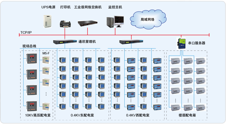环智国际大厦配电系统主要包括:一个10KV高压配电室、2个0.4KV低压配电室和132个楼层配电箱。10KV配电间主要包括2路10KV进线柜、2个量电柜、2个避雷器柜、4个10/0.4KV变压器馈线柜。10KV配电间总共使用了8台M5-F微机保护装置。0.4KV总进线部分选用ACR330ELH网络电力仪表,0.4KV的馈线回路选用了ACR220ELF网络电力仪表。电力监控系统需要通过T1-T4变压器温度控制箱的RS485接口采集变压器绕组超温报警信号、铁芯超温报警信号以及传感器故障信号,并要具有声音报警功能。需要采集直流柜的电池充放电状态、电池组电压、电池组电流、电池房温度等信号,并通过直流屏信息表在界面上显示出来。