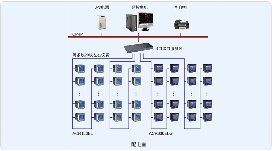 整个系统采用网络分布式结构,监控主机位于地下一层变电所值班室内,配电柜内安装有本公司ACR330ELH、ACR120EL仪表共计60多回路。仁恒河滨花园电力监控系统现场共1个低压配电室,配电室内采用安科瑞ACR系列电力监控仪表采集各回路的电流、电压、电能等电参量,然后通过中间层采集设备网线到监控室计算机上,实现遥测、遥信功能。