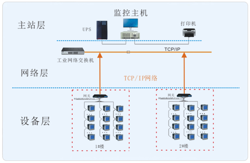 系统采用Acrel-5000能耗管理系统,该系统主要采用分层分布式计算机网络结构,如系统结构:站控管理层、网络通讯层和现场设备层。其中上海环境监测中心项目现场设备分布为1#楼及2#楼,该所有监测点都在楼层强电井的配电箱内,所有仪表通过485屏蔽双绞线铺设至值班室,经采集器至系统主机从而完成仪表数据的采集并管理。