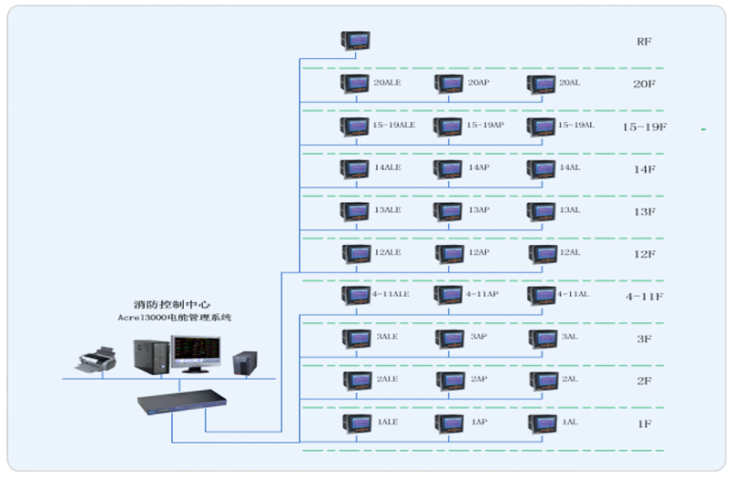我司本项目承接其楼层部分电能管理系统搭建,完成对配电回路用电的实时监控和管理。该项目进出线回路均采用ACR多功能液晶显示仪表,其是针对电力系统、公共设施、智能大厦的电力监控需求而设计的网络电力仪表,它能测量所有常规电力参数,如:三相电压、电流、有功功率、无功功率、功率因数、频率、有功电度、无功电度。现场仪表以手拉手方式通过屏蔽双绞线(RVVSP2*1.0)进行通讯连接,每根总线连接智能仪表数量在20只左右,不同种类的智能装置连接在不同的总线上,然后将数据上传至数据采集器,进而将数据上传至当地监控终端。