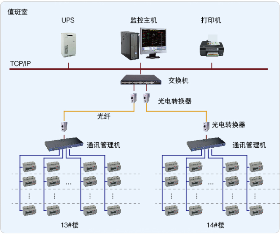 该项目有两栋楼,均为六层,一共有532个房间,其中13#栋彝学院289个房间,14#栋藏学院243个房间,采用我司ADF100单相多用户电能表195个,分为24条RS485总线接至通讯管理机,通讯管理机通过光纤拉至值班室连接到Acrel-3000预付费电能管理系统后台,实现总线上仪表与监控主机的数据连通。该系统为学校宿舍项目解决用电问题提供了真实可靠的依据,取得了较好的管理水平。