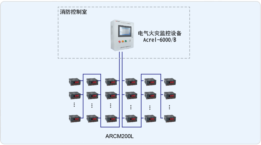 安科瑞于2014年9月承接了该项目电气火灾监控系统,整套系统由壁挂式电气火灾监控装置安科瑞Acrel-6000/B、ARCM200L剩余电流式火灾探测器组成。现场低压配电柜内探测器采用2条485总线接至消控中心的Acrel-6000/B壁挂式电气火灾监控系统,当现场保护线路中的被探测参数超过报警设定值时,发出报警信号、控制信号,指示报警部位并保存报警信息。