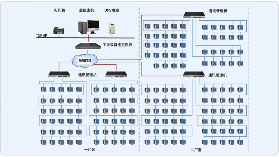 系统通过安装在工厂电网中主要受电点和枢纽配电柜中的电能监测仪表采集到配电网的各项电力参数信号,再将信号转换为数据传输到计算机中,计算机对数据进行存储、计算和分类存储到数据库中,然后通过计算软件将电能以报表、图表的形式进行展示。
