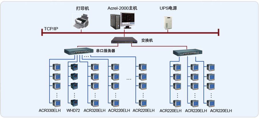 该院新建大楼系统分为配电室和楼层部分,配电室高压部分采用ACR330ELH采集谐波数据,WHD72采集温湿度数据;低压进线侧采用ACR320ELH采集谐 波、功率因数等数据, ACR220EK网络电力仪表采集测量电流,开关状态由辅助触点接入ACR220EK仪表的DI(开关量输入)接口。楼层部分由ACR220E采集电能数据。所有电参量数据由仪表的通讯接口经RS-485总线传给上位机,实现遥测、遥控和遥信功能。