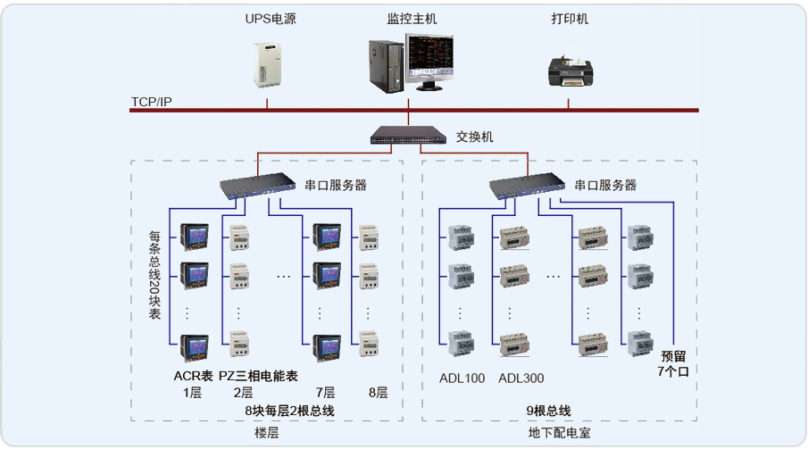 黑龙江省大豆乳品研发中心电能管理系统的监控范围为地下二层配电间采用的ACR网络电力仪表和PZ三相电能表共182台,地上八楼层配电箱采用的ADL100和ADL300导轨式电能表共321块。系统应用分布式网络结构,采用32根屏蔽双绞线将设备层的仪表连接至通讯层的两台16口串口服务器,又通过TCP/IP将数据上传至监控层的工业计算机进行采集、分析、存储。
