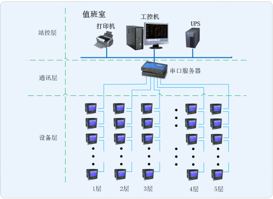 本项目是为罗店镇市民服务中心楼层配电部分设计的电能管理系统,监控范围为8层楼内的多功能仪表。现场多功能仪表通过总线接入值班室采集器,再将通过采集器连接到监控主机,从而在监控主机上实现总线上仪表与监控主机的数据连通。通过Acrel-3000电能管理系统对楼层用电环节进行记录与统计,借助计算机辅助手段进行集抄,节省人工成本。