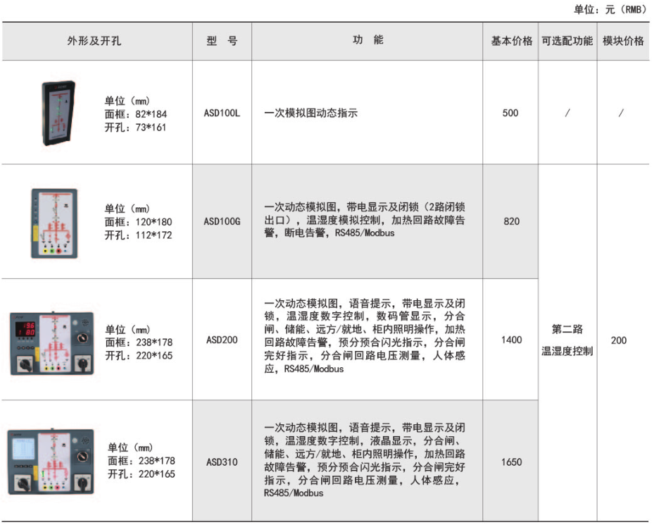 ASD系列开关柜综合测控装置具有一次回路模拟图及开关状态指示、高压带电显示、自动温湿度控制、人体感应自动照明、语音提示、电参数测量及RS485通讯接口等功能,集操作、显示于一体,直观地体现柜内元件的工...