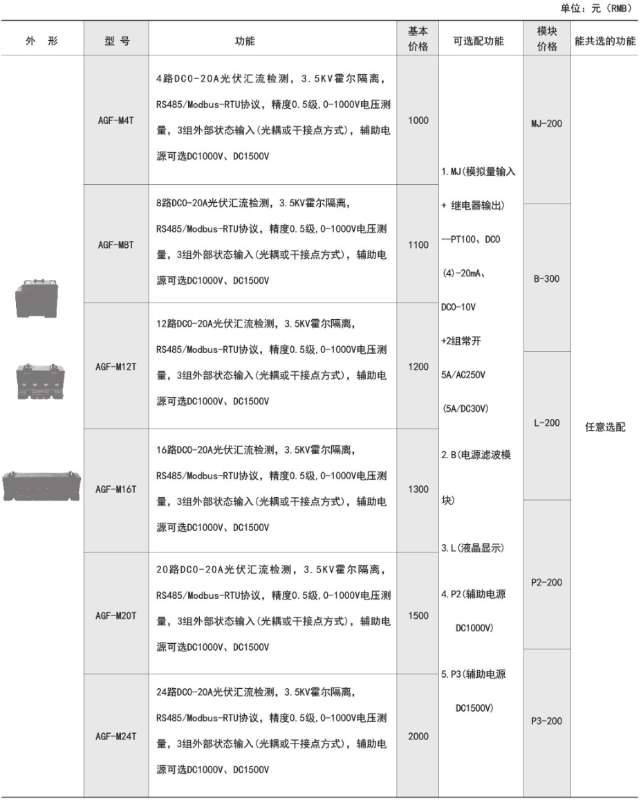 立即咨询AGF-T穿孔式光伏汇流采集装置是专门应用于智能光伏汇流箱,用于监测光电池阵列中电池板运行状态,组串电流测量,汇流箱中防雷器状态采集、直流断路器状态采集、装置带有RS485接口可以把测量和采集到的数据和设备状态上传。