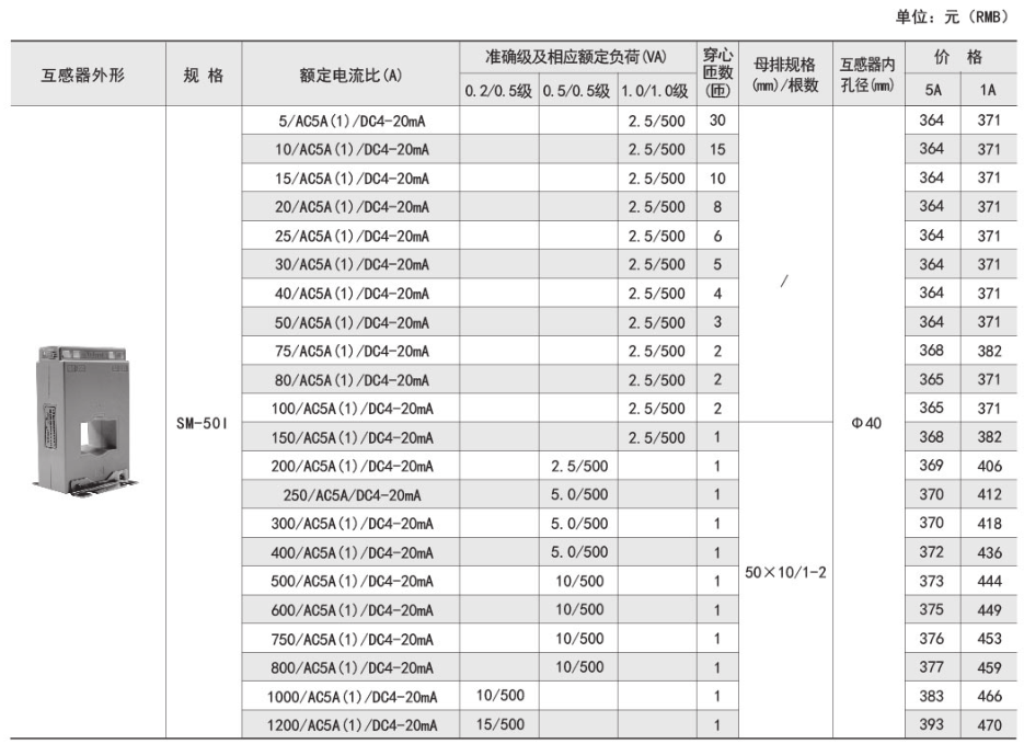 技术要求:额定电流比500A/5A/20mA;准确级0.5/0.2级;穿心匝数1匝;内孔径φ40mm。