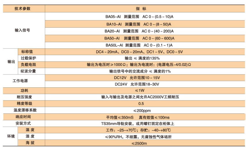 BA系列产品应用电磁感应原理,对电网中的交流电流进行实时测量,将其隔离变换为标准的直流信号输出。