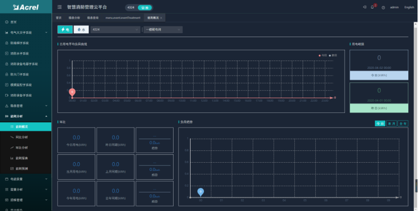 智慧用电子系统可以接入电气火灾、孤航电弧、电气火灾主机、灭弧式保护器探测器和无线测温探测器等。点击智慧用电子系统进入智慧用电监控页面,点击第一级显示整个项目的基础信息和该项目下的所有探测器的信息,点击末级节点显示具体探测器的监控页面。