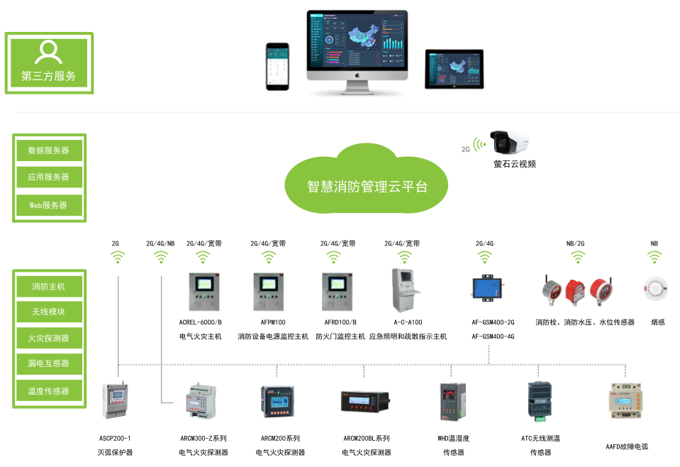 智慧消防管理云平台包含了智慧用电子系统、防排烟子系统、消防水子系统、消防设备电源子系统、防火门子系统、消防设备管理子系统和视频监控子系统等。