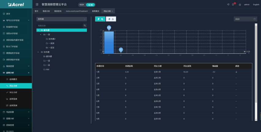 能耗分析功能包括了能耗概况、能耗同比、能耗环比、能耗报表和能耗预测等五个模块。可以查看登录用户下的所有项目 的能耗统计、同环比和报表,且按日、周、月等维度进行能耗预测分析。