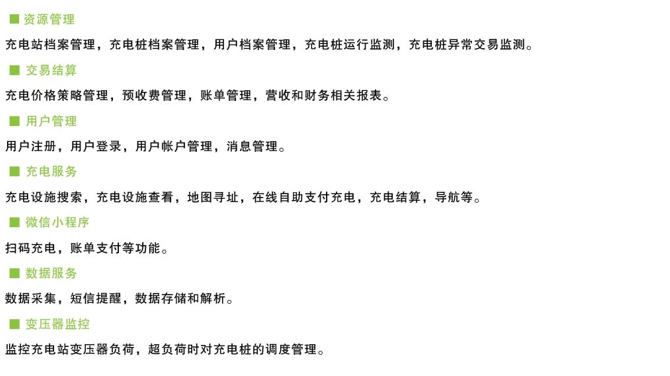 充电桩可选配WIFI模块或GPRS模块接入互联网,配合加密技术和秘钥分发技术,基于TCP/IP的数据交互协议,与云端进行直连。云平台包含了充电收费和充电桩运营的所有功能,包括财务管理、变压器监控和运营分析等功能。