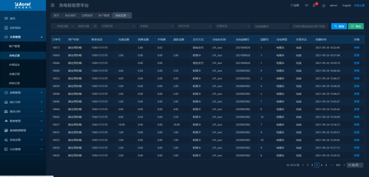 | 远程充电桩电能管理系统 | Acrel-9000 | (一)资源管理充电站裆案管理,充电桩裆案管理,用户裆案管理,充电桩异常交易监测(二)交易结算充电价格策略管理,预收费管理,账单管理,营收和财务相关报表(三)用户管理用户注册,用户登录,用户帐户管理(四)充电服务充电设施搜索,充电设施查看,地图寻址,在线自助支付充电,充电结算,导航等(五)微信小程序扫码充电,账单查询、充电信息监测等功能(六)数据服务数据采集,致据存储和解析(七)收益隔天结转到帐 |