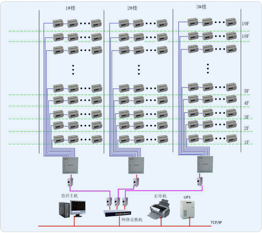 项目对黄金时代大厦各动力箱、照明箱等终端配电箱内各用电回路用电量进行电能管理,系统通过多功能的电能计量表计、通讯网络和计算机软件,实现各用电设备在运行过程中的实时数据采集、数据计算、数据统计、用电分析等,保证复杂供配电系统的安全可靠系数,实现故障快速响应;掌握大厦能源消耗的成本结构,确保节能计划和措施顺利实施;科学、智能管理,提高效率,降低损耗,实现经营成本优化。系统由站控管理层、网络通讯层和现场设备层构成。系统要求尽量减少集中采集数据的装置以保证系统的通讯可靠性。
