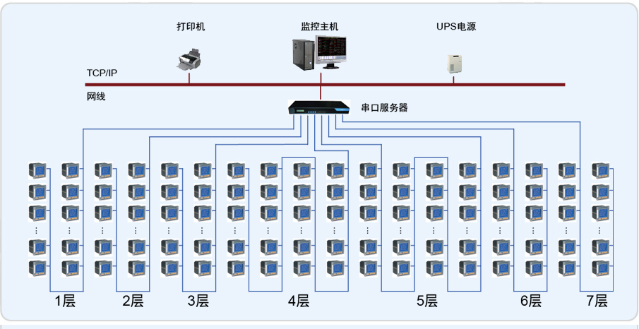 本项目电力监控系统采用分布式结构,为现场层、通讯层和后台监控层。现场层指分布于于各楼层动力箱及地下配电室内的安科瑞系列仪表,通讯层包括NPORT5630-16串口服务器、网络交换机等,后台监控层包括计算机、打印 机、UPS电源等。通讯层及后台监控层都位于地下监控室内。现场所有安科瑞系列仪表通过屏蔽双绞线拉到地下监控室内,与串口服务器相连,经交换机与计算机连接,实现数据采集。