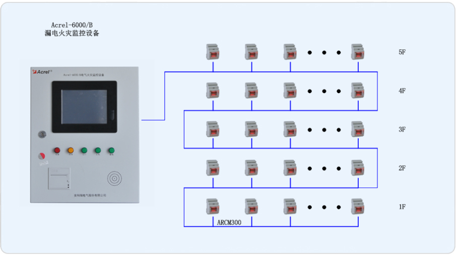 系统组网共分为站控管理层、网络通讯层、现场设备层三层,该项目通讯总线共接入一条通讯总线,总线在楼层配电箱手拉手串接后,接入壁挂式后台,组成电气火灾系统的大动脉。箱体中漏电流互感器通过电流线接入漏电探测器,漏电探测器实时显示漏电情况,组成一套信号稳定,精度可靠的电气火灾监测系统。