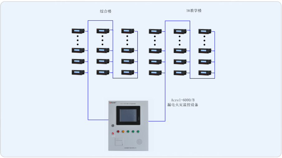 本项目主要是针对上海复旦高等艺术实训基地内的两栋教学楼设计电气火灾监控系统。在部分楼层配电柜的重要回路安装安科瑞研发的ARCM系列剩余电流式电气火灾监控探测器,并为其配置一套Acrel-6000/B电气火灾监控系统,电气火灾监控系统实时监测重要回路的剩余电流值、箱体回路的实时温度,监测的数据实时传输至后台主机,当发生剩余电流值越限、温度越限时,后台能进行声光报警,同时后台能够和消防火灾报警系统实现消防联动。