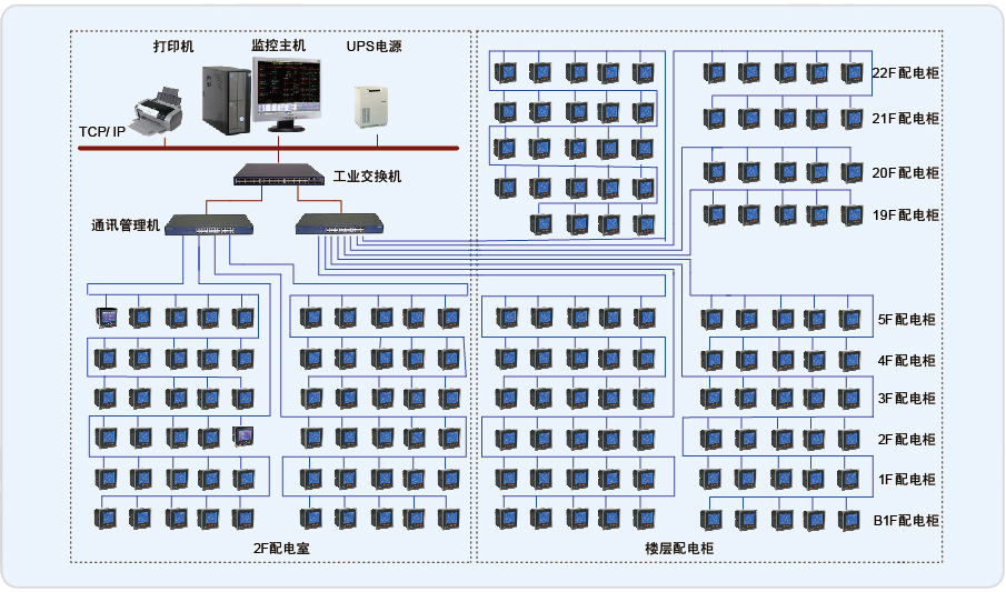 上海百乐门大酒店电力监控系统监控范围为百乐门大酒店的22个楼层的PZ系列电力仪表和配电室的PZ、ACR系列电力仪表进行远程监测。现场设备全集中在同一个配电室中,业主的电气值班室就近安排在配电室旁,本系统监控中心也安置在该值班室中。系统组网采用常见的3层结构,站控管理层、通讯管理层和现场设备层。