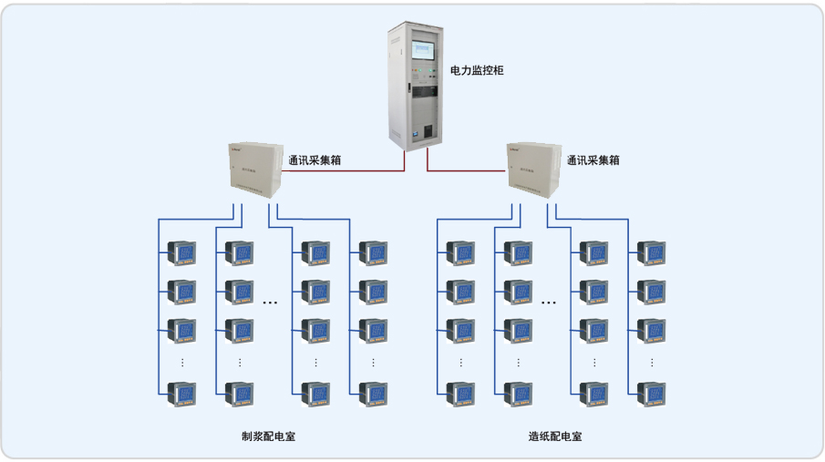 10kV回路的进线和馈线配有微机保护装置;0.4kV进线和母联回路装有ACR330ELH电网质量分析仪,采集回路的常规电参量、四象限电度和电网质量参数;0.4kV馈线回路装有PZ80L系列多功能电力仪表,采集回路的常规电参量和四象限电度。本系统仪表集中,所以均通过屏蔽双绞线手拉手相连数据上传至监控主机。