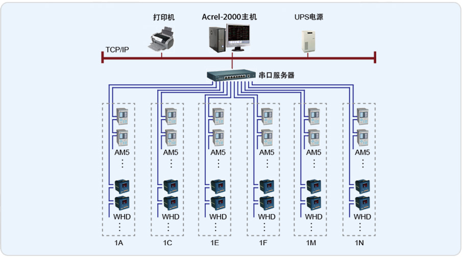 监控系统主要监控多晶铸20kV高压、0.4 kV低压,该系统总计有159只仪表(其中包括142只进线保护,2只PT保护、8只变压器保护、6只温控仪),共10条总线,低压变电所和高压室离值班室距离不远,直接采用屏蔽双绞线连接至串口服务器,再通过网线连接到网络交换机上,监控主机通过网络交换机实现总线上仪表与监控主机的数据连通。