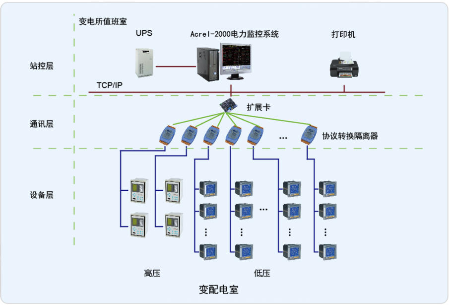 本项目承接其10KV配电增容改造变电所部分电力监控系统,其中有两路高压进线,配有综合保护装置,低压部分,进线柜、馈线柜配有仪表。通过Acrel-2000电力监控系统,实时监测变电所内各个回路的电流、电压、功率、开关状态等电参量,由此达到变电所少人值守或无人值守的智能化管理。
