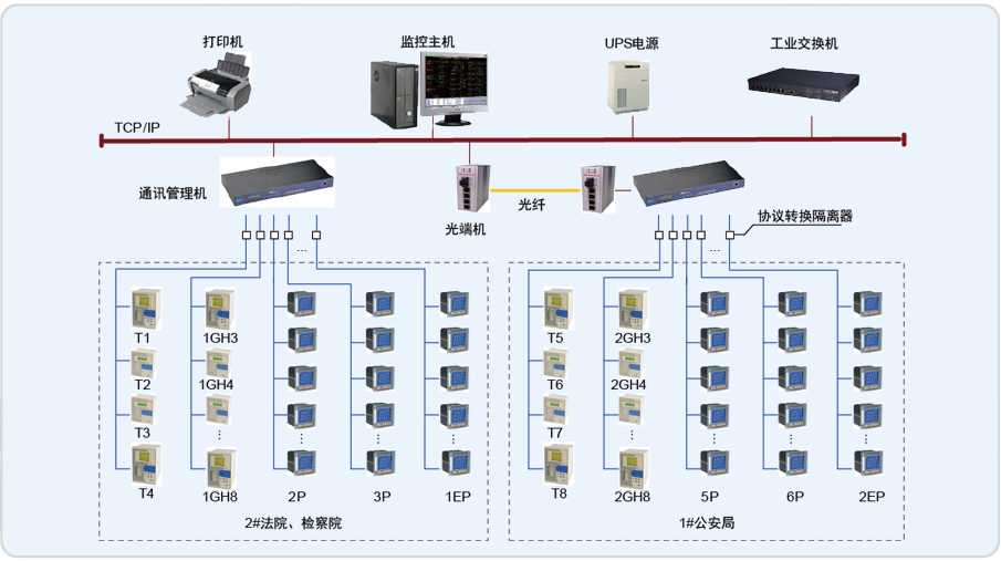 该项目有1#(公安局)、2#(法院、检察院)两个变配电室,室内的配电柜中安装了安科瑞332块PZ系列可编程智能电测表。为了能够实现电力参数实时遥测、电能计量、电能报表等功能,系统采用Acrel-3000电能管理软件,做到集中管理、集中控制,省去了值班人员现场抄表的烦琐,具有投资少、简明实用、便于智能管理等优点。