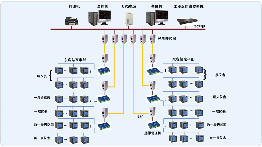 成都东客站电能管理系统采用双机服务,位于东客站一层西南角值班中心,同时该系统配有6台管理机,根据现场仪表的分布范围,合理的分配6台管理机的管理范围;为保障数据传输的实时性和稳定性,均采用光纤进行数据上传。在值班室对管理机上传的数据进行多样式表现方式,画面比较形象直观;系统同时具备向BA系统转发数据的功能。