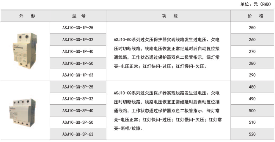 ASJ10-GQ系列自复式过欠压保护器(以下简称ASJ),适用于单相交流电压230V或三相电压400V,频率50Hz,额定工作电流至63A及以下的用户或负载。由中性线故障引起的单相或三相线路过、欠电压...