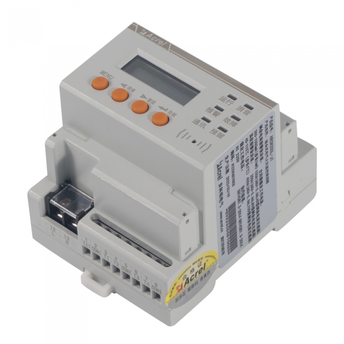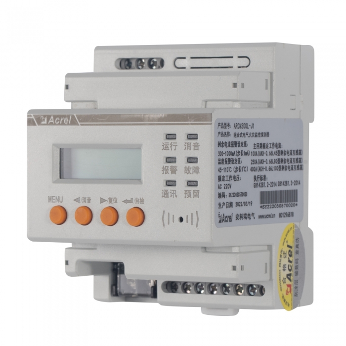 ARCM300L-J1:监测一路剩余电流和四路温度,一路继电器输出,声光报警,485 通讯,事件记录, LCD 显示,1 路 RS485/MODBUS 通讯,导轨式安装;