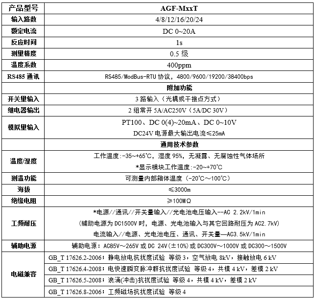 AGF-T穿孔式光伏汇流采集装置是专门应用于智能光伏汇流箱,用于监测光电池阵列中电池板运行状态,组串电流测量,汇流箱中防雷器状态采集、直流断路器状态采集、装置带有RS485接口可以把测量和采集到的数据...