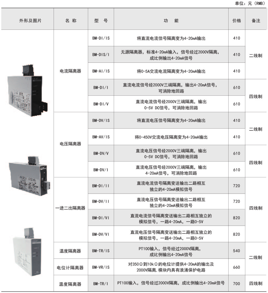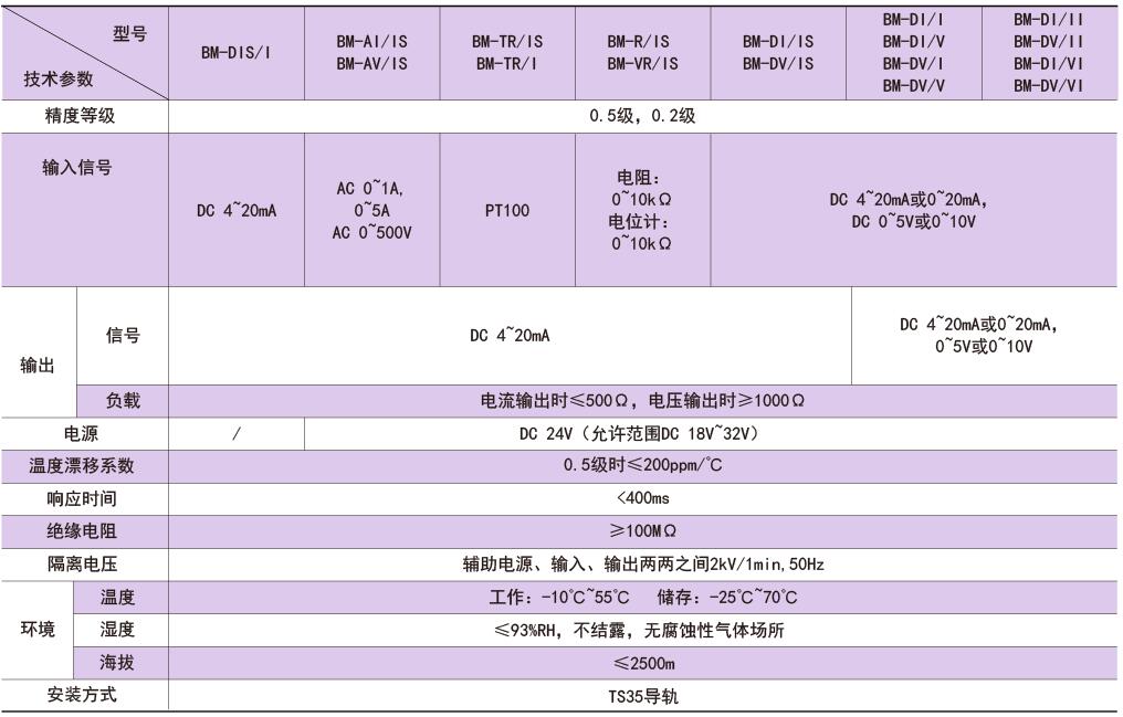 BM系列模拟信号隔离器可以对电流、电压等电量参数或温度、电阻等非电量参数进行高速精确测量,经隔离转换成标准的模拟信号输出。既可直接与指针表、数显表相接,也可以与自控仪表(如PLC)、各种A/D转换器以...