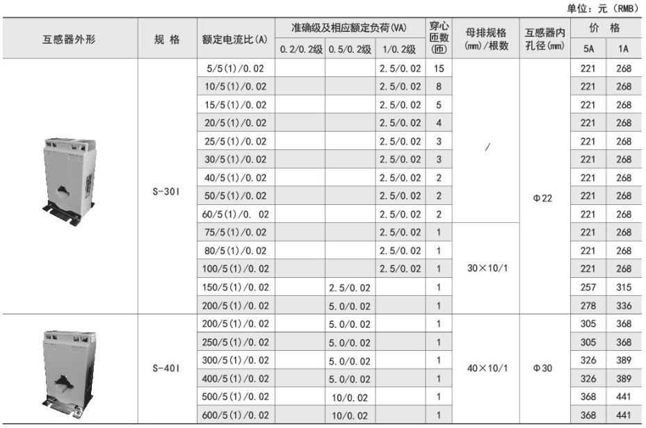 技术要求:额定电流比500A/5A/20mA;准确级0.5/0.2级;穿心匝数1匝;内孔径φ40mm。