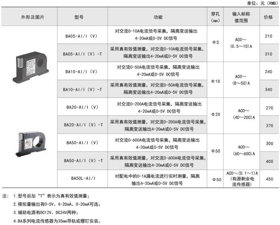 BA系列产品应用电磁感应原理,对电网中的交流电流进行实时测量,将其隔离变换为标准的直流信号输出。应用于工业自动化领域。具体型号:BA10-AI/I技术要求:输入电流AC 0-50A;输出DC 4-20...
