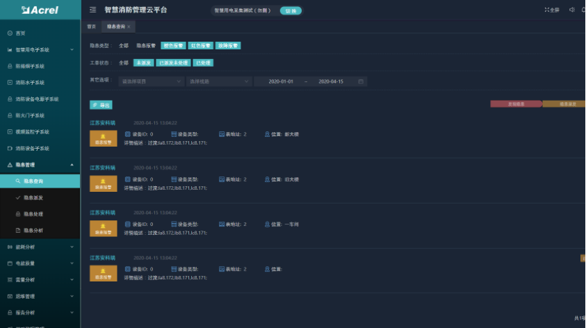 隐患管理功能包括了隐患查询、隐患派发、隐患处理和隐患分析四个模块。可以查看登录用户下的所有项目的隐患信息,并进行派发和处理操作,且对所有隐患进行统计分析。