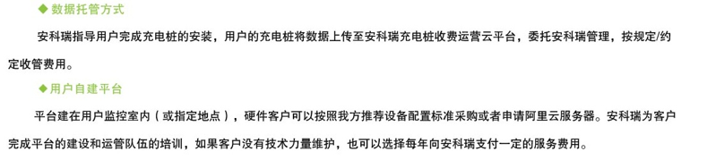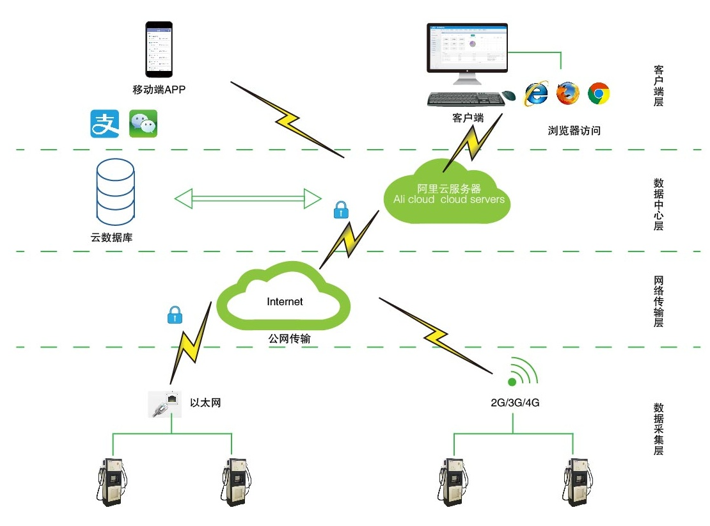 充电桩可选配WIFI模块或GPRS模块接入互联网,配合加密技术和秘钥分发技术,基于TCP/IP的数据交互协议,与云端进行直连。云平台包含了充电收费和充电桩运营的所有功能,包括财务管理、变压器监控和运营分析等功能。