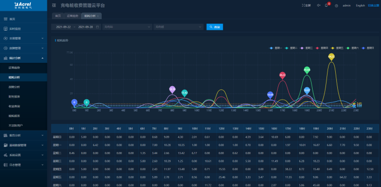可查看指定时段充电站和充电桩的用电量,显示对应的能耗趋势图并进行同环比分析。