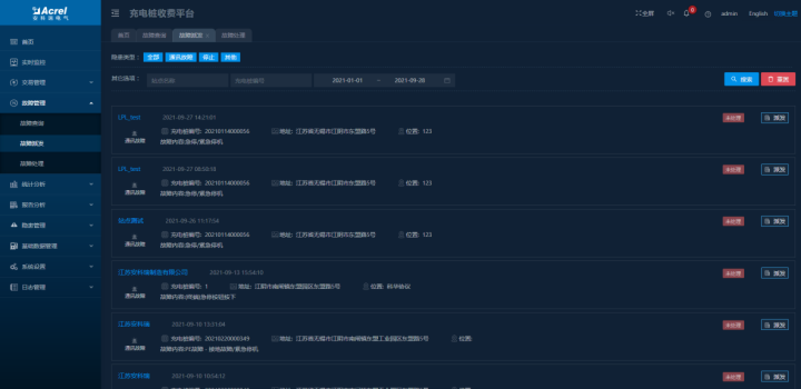 显示待派发的充电桩故障信息,派发之后生成工单,由运维人员到现场处理故障。